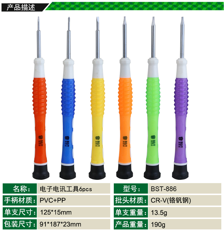 返回當(dāng)前位置: 首頁(yè) / 產(chǎn)品中心 / BST-886 電子電訊工具6pcs 螺絲套批 螺絲刀套裝
