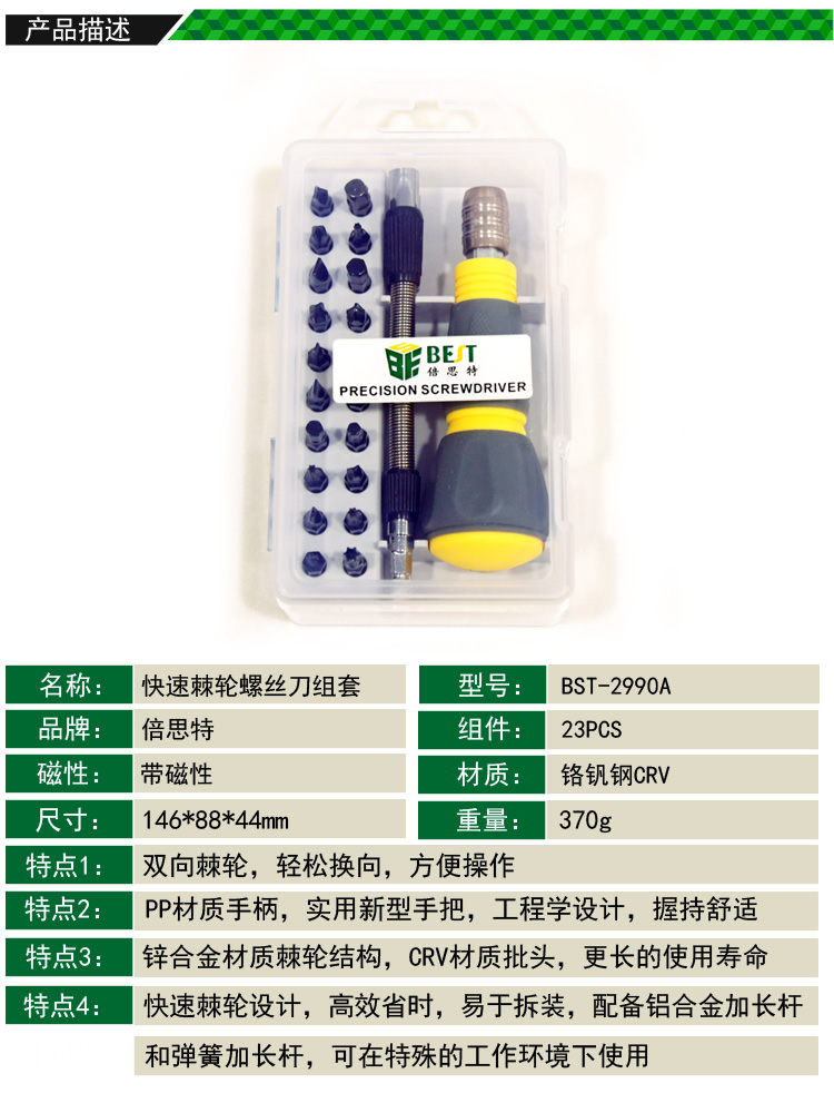 返回當(dāng)前位置: 首頁 / 產(chǎn)品中心 / BST-2990A 23件套 快速棘輪螺絲刀組套
