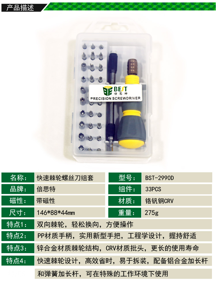 返回當前位置: 首頁 / 產(chǎn)品中心 / BST-2990D 33件套 快速棘輪螺絲刀組套